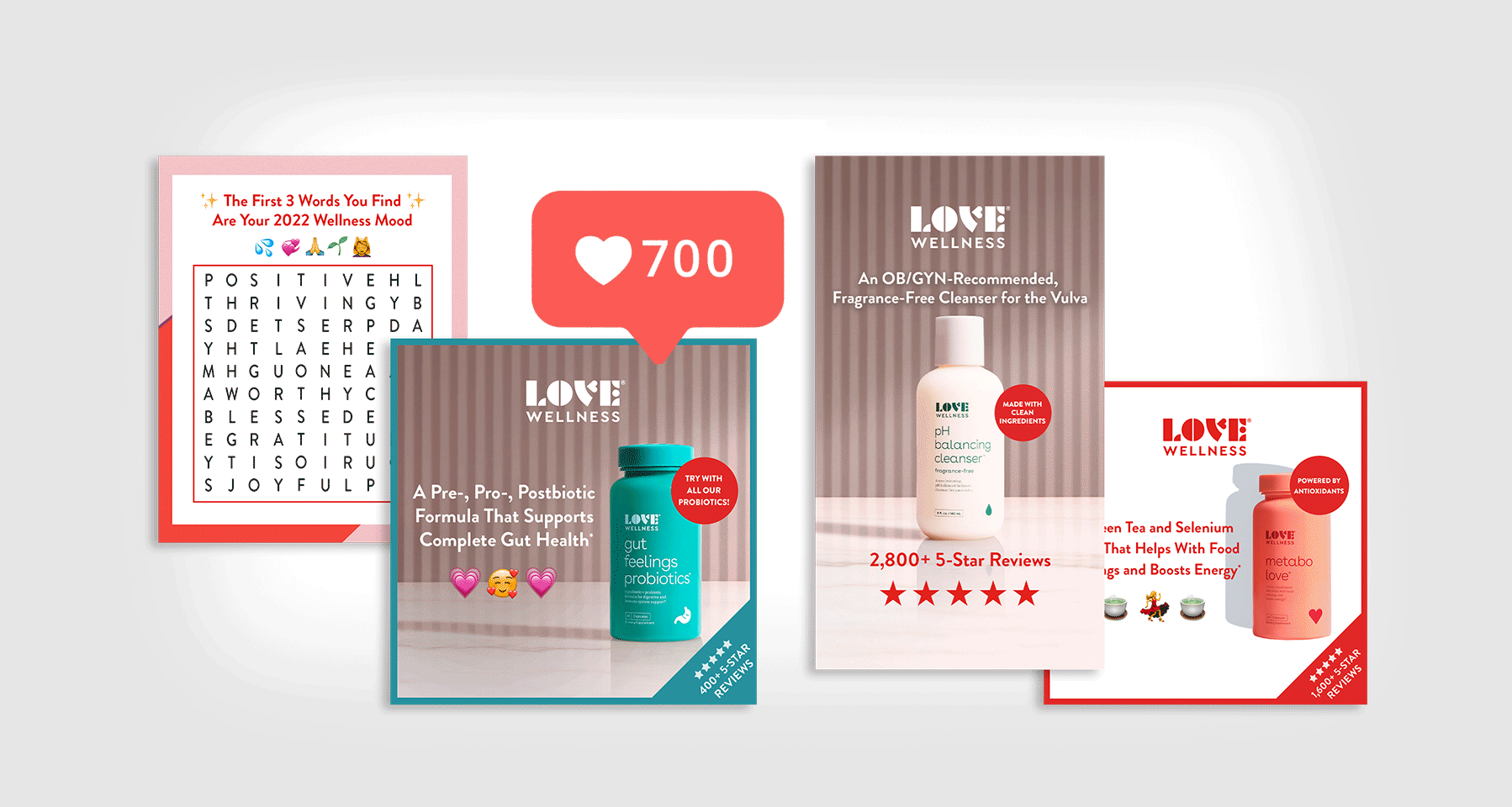 Outcome: I implemented updated brand guidelines to create a series of graphic assets that positioned Love Wellness as the first-choice in No BS feminine health products. Blunt, straight forward messaging combined with approachable and welcoming visuals removes the barrier to entry by creating a welcoming and safe environment to learn about how you can easily Love Yourself Well.